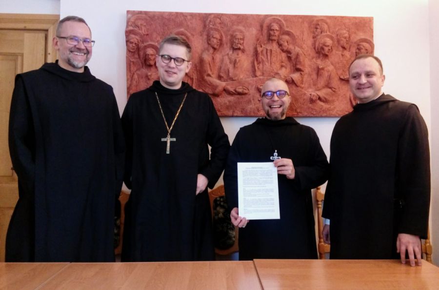 The Abbot President Maksymilian Nawara OSB and Izaak Kapała OSB the prior conventual of Lubiń, Szymon Hiżycki OSB the abbot of Tyniec, Marcin Gromadecki OSB the prior conventual of Biskupów signed the declaration of cooperation on behalf of their communities. The subject of cooperation is the newly established Benedictine foundation in Lviv / Ukraine.
